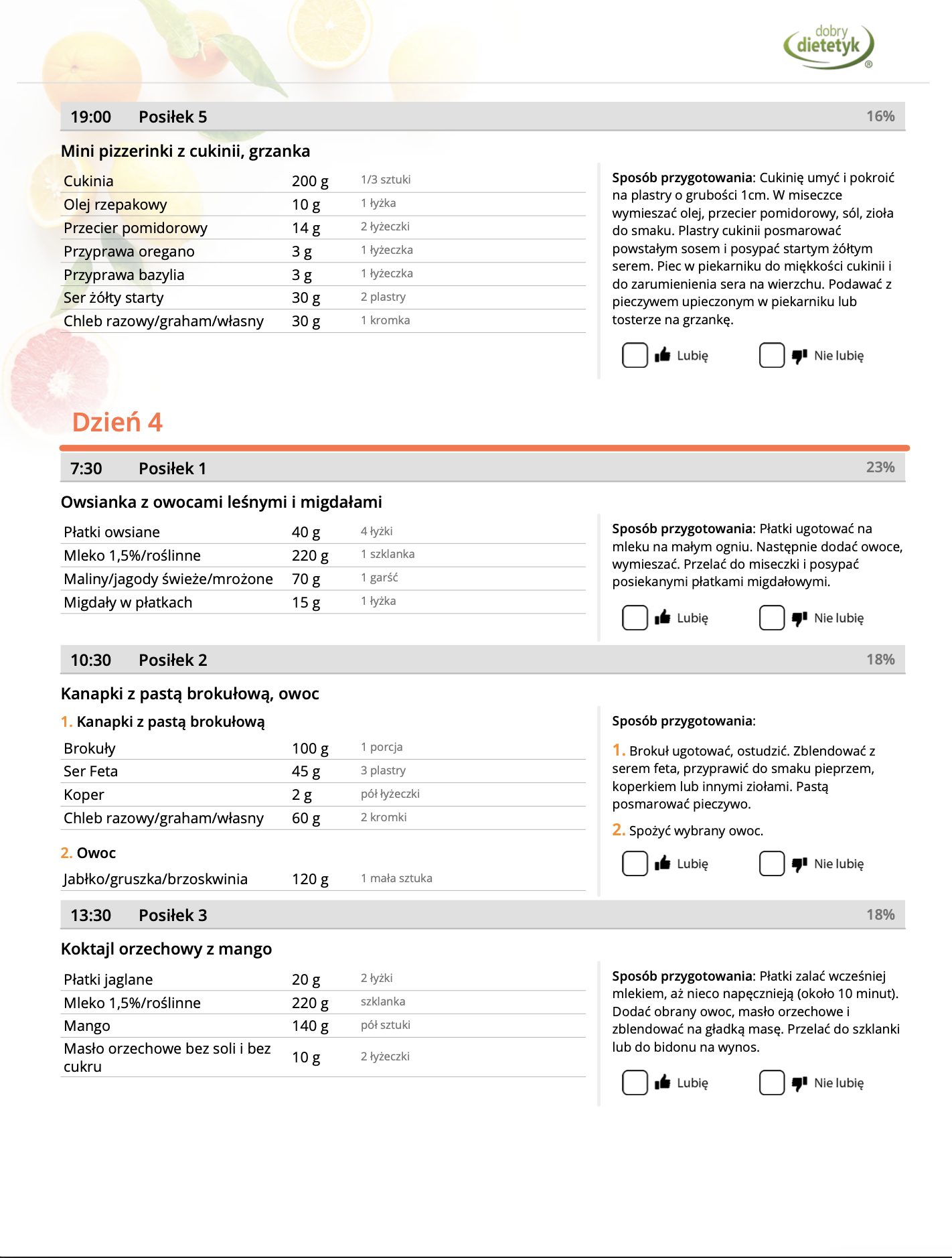 • w formie precyzyjnych jadłospisów wielodniowych (na każdy dzień miesiąca jest opracowany osobny jadłospis). Tutaj nie musisz zastanawiać się co zjeść każdego dnia, gdyż będziesz mieć dokładnie wszystko rozplanowane.