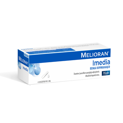 Melioran Imedia na bazie specjalnie wyselekcjonowanych składników: ekstraktów z L-teaniny, passiflory oraz rhodioli przeznaczony jest dla osób potrzebujących odprężenia w sytuacjach okazjonalnego stresu lub oczekiwania. Teanina i passiflora sprzyjają odprężeniu. Rhodiola łagodzi stres. Przeciwwskazania: Niezalecane dla dzieci poniżej 12 roku życia, kobiet w ciąży lub karmiących piersią oraz osób z chorobą afektywną dwubiegunową. W przypadku jednoczesnego stosowania leków psychotropowych skonsultuj się z lekarzem. Zaleca się monitorowanie stanu zdrowia jeśli Melioran przyjmowany jest jednocześnie z lekiem na nadciśnienie tętnicze.Rekomendowany do suplementacji w: